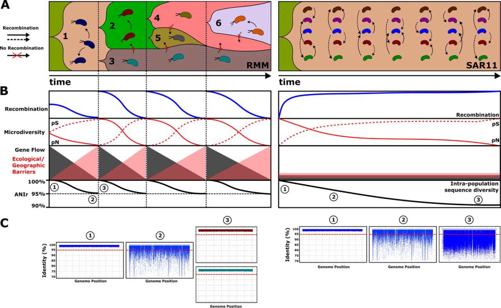 Evolutionary model for reference marine microbes (RMM) and SAR11 populations. RMM evolution is characterized by “hard” selective sweeps that reduce genomic diversity, and only a single adaptive lineage arises from the population. However, SAR11 evolution is characterized by “soft” sweeps, where multiple beneficial mutations contribute to an adaptive substitution, which are dispersed by the population, contributing to an increase in genetic diversity. (A) Relative abundances of the populations (y axis) and evolution over time (x axis). (B) Dynamics of different evolutionary parameters over time, where each vertical dotted line differentiates different diversification events in RMM, while in SAR11 populations, the same structure is maintained over time. (C) Recruitment plot showing intrapopulation sequence diversity. The red dashed line indicates the species threshold (95%). Different colors indicate different populations. (doi: 10.1128/mSystems.00605-20).